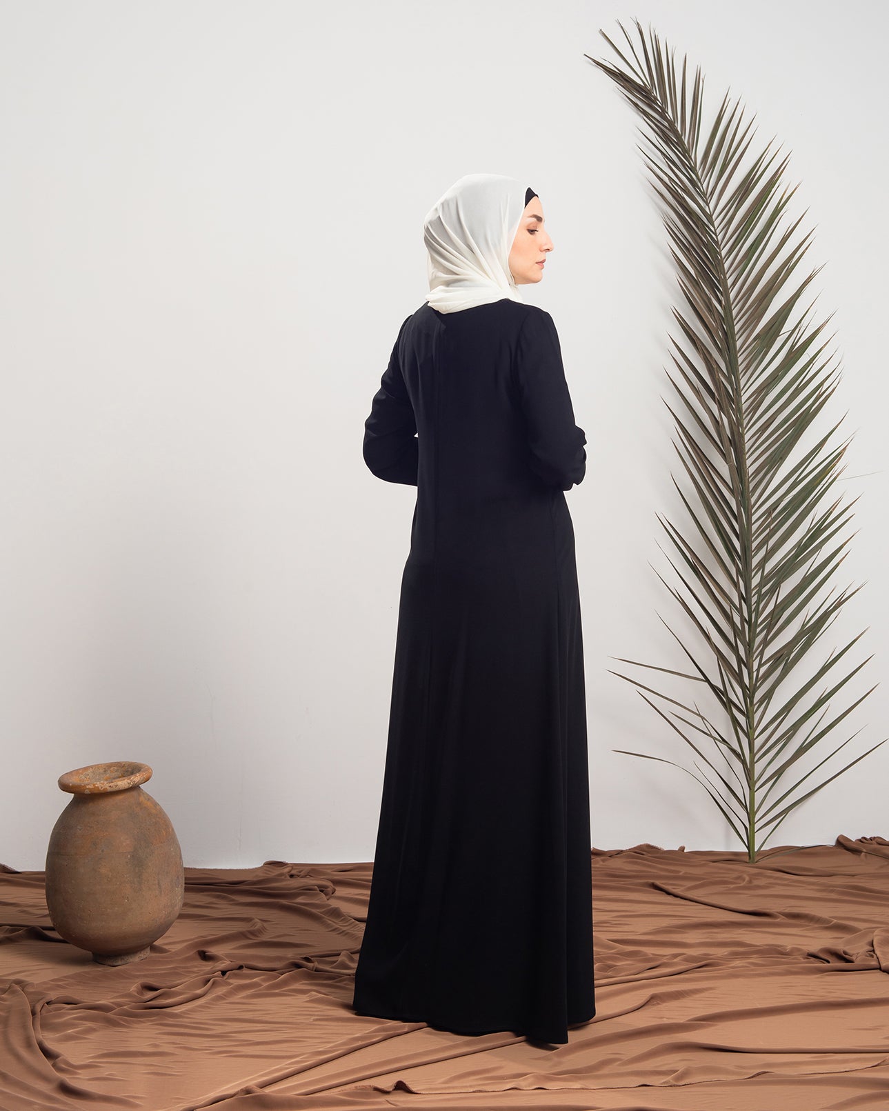 Introducing our Basic Black Sleeved Crepe Abaya, a timeless and versatile piece that combines simplicity and sophistication.