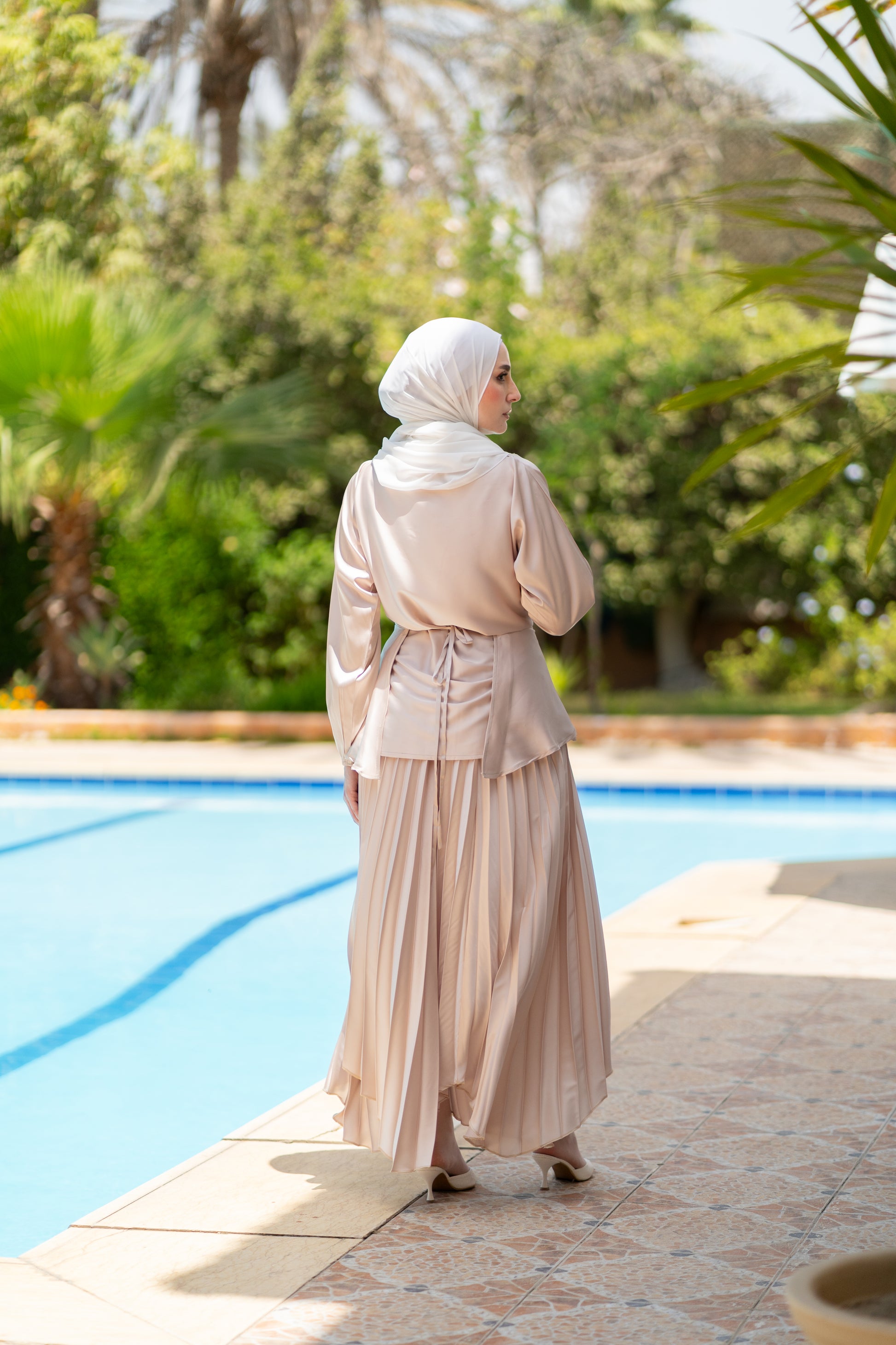 a stunning pleated satin set available in **Beige, Black, and Olive**! This luxurious ensemble combines sophistication with comfort, making it perfect for any occasion.