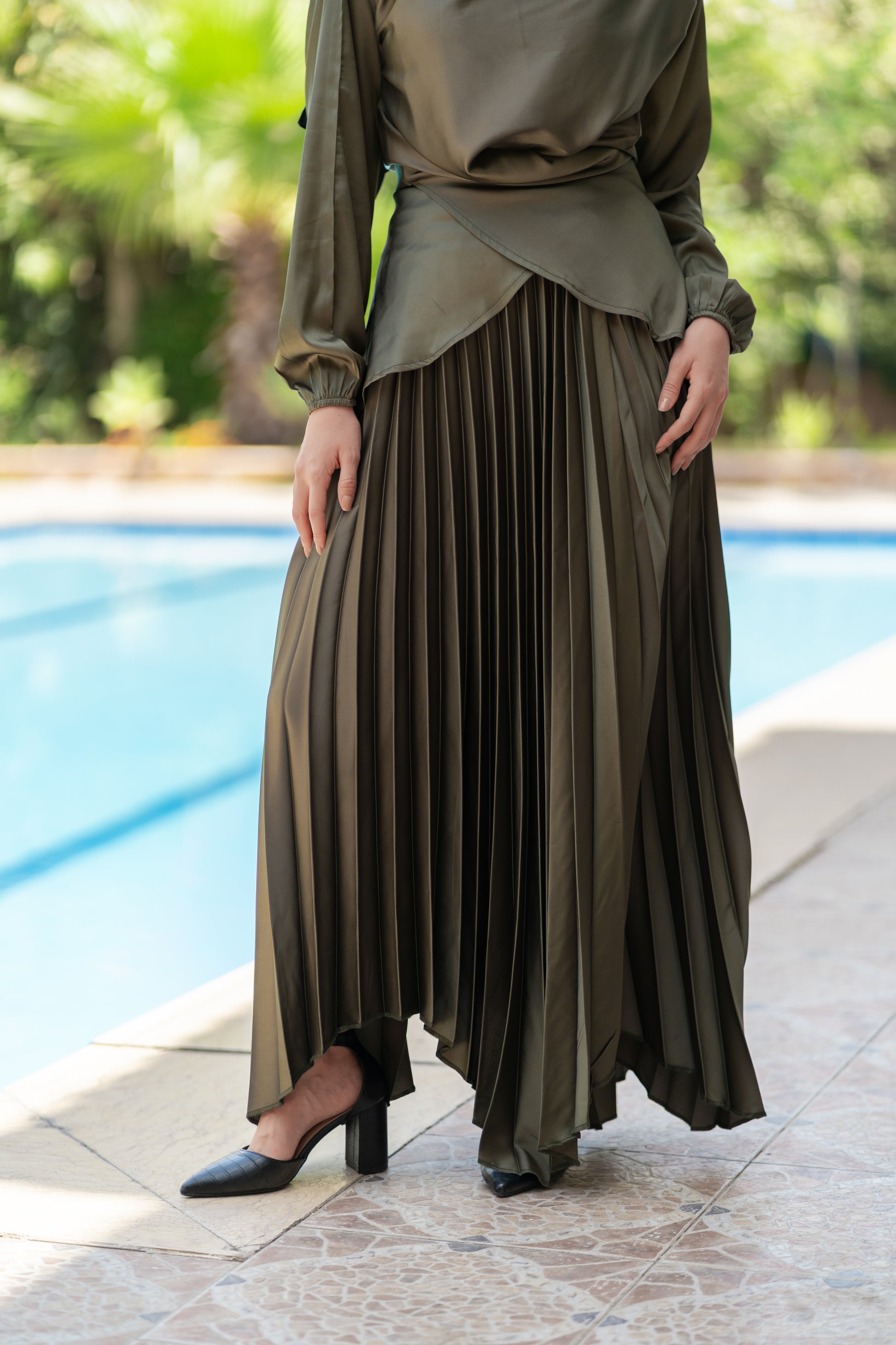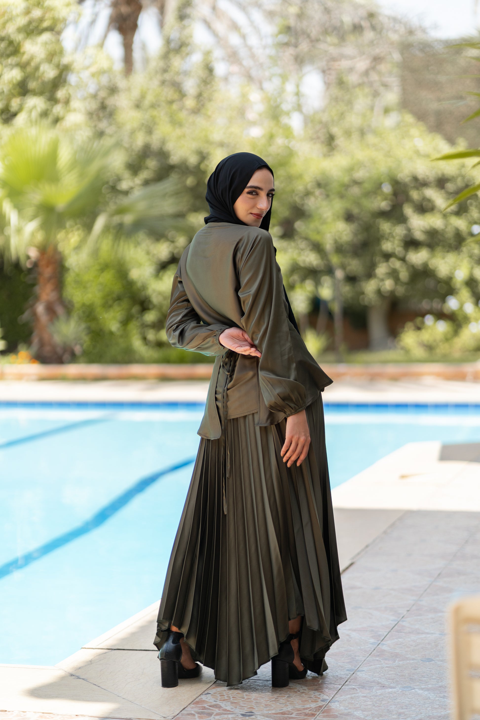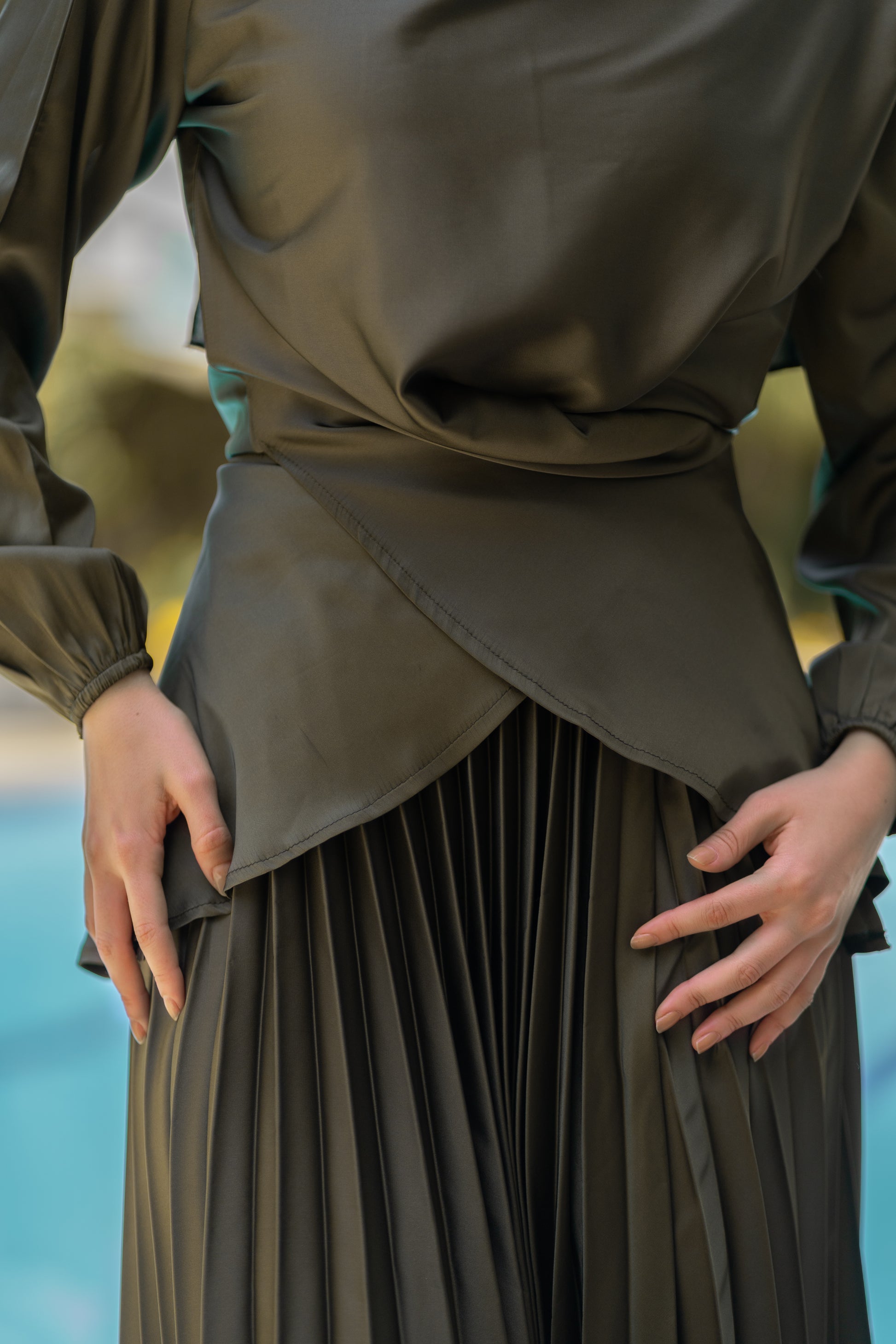 a stunning pleated satin set available in **Beige, Black, and Olive**! This luxurious ensemble combines sophistication with comfort, making it perfect for any occasion.