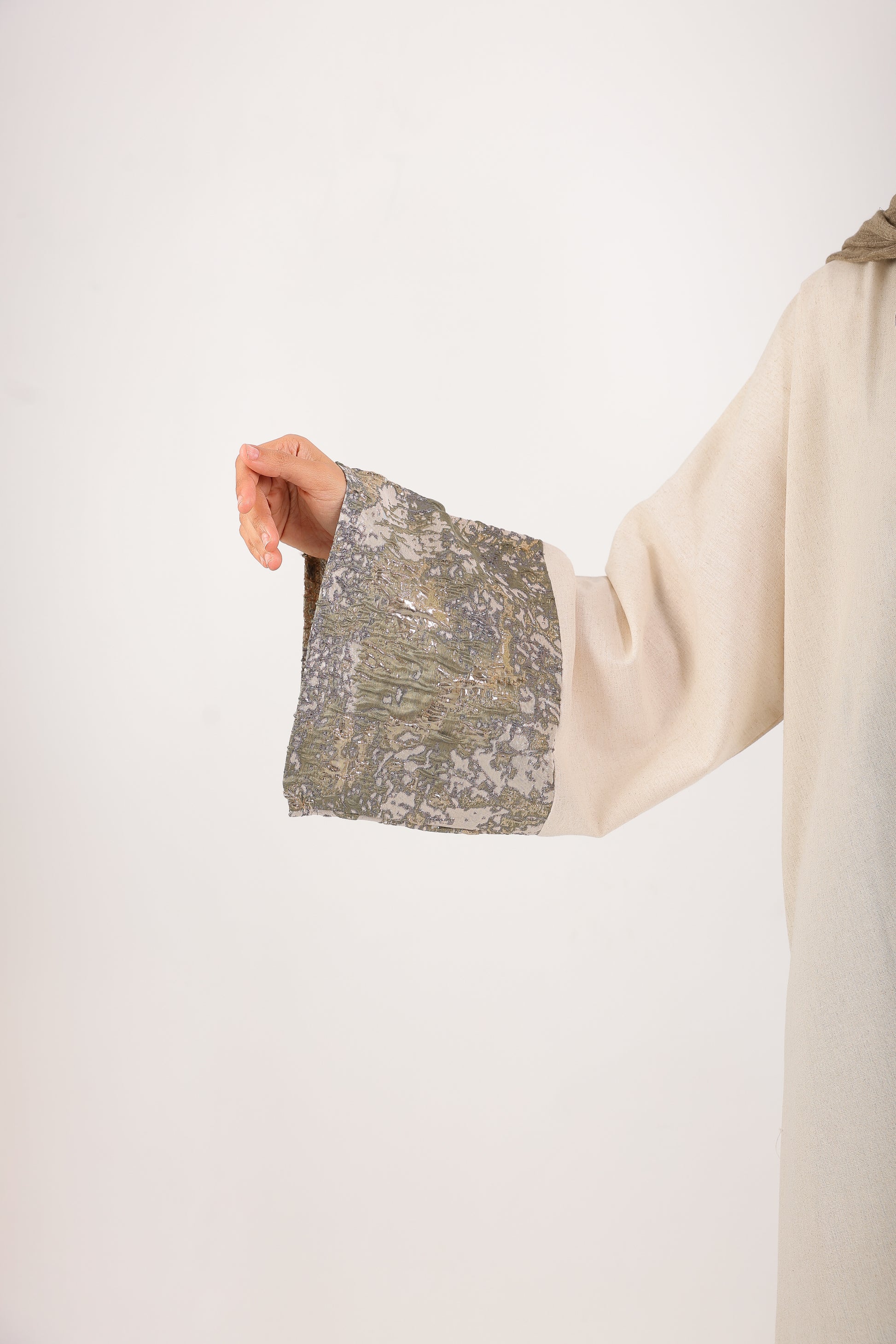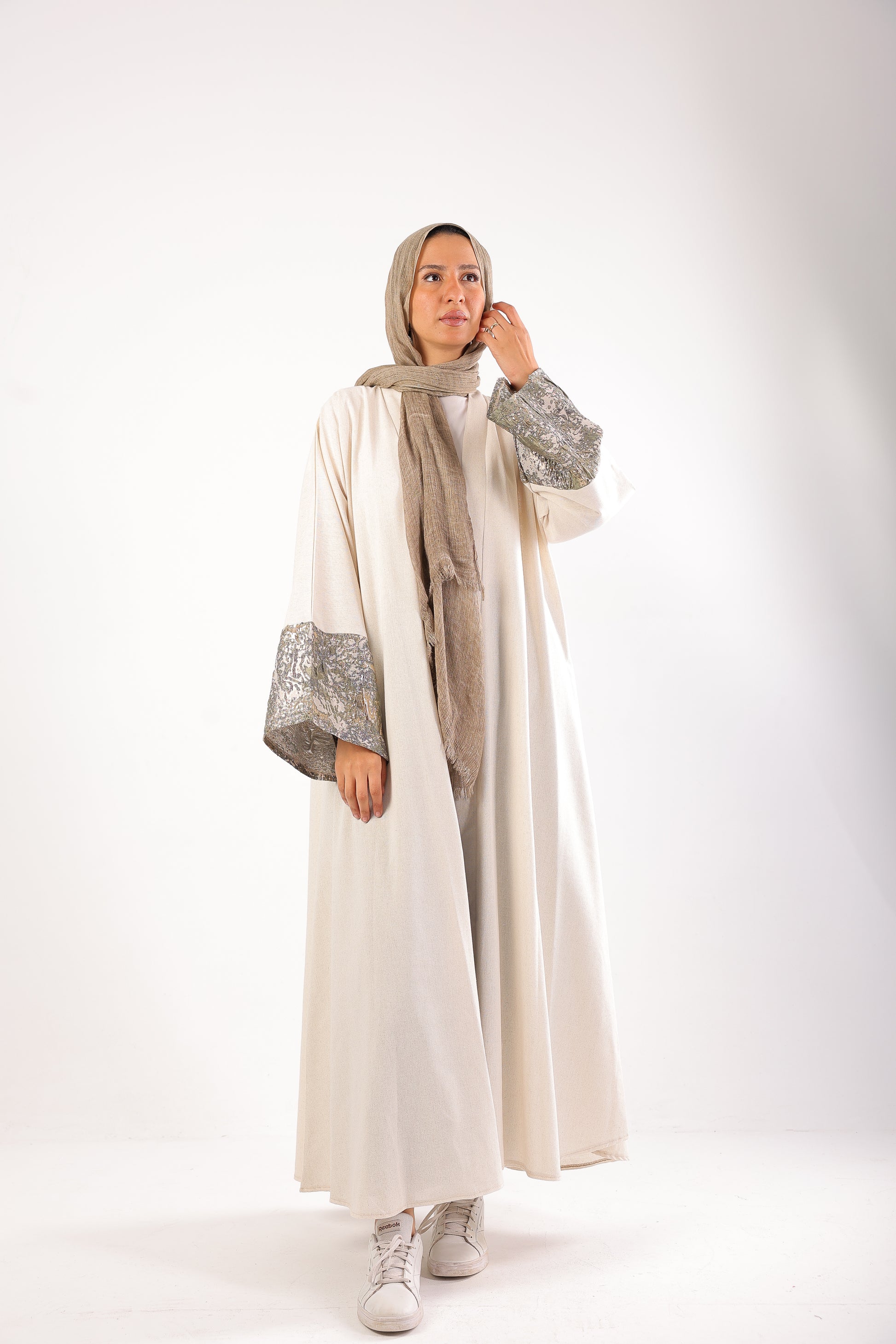 This wide caftan features a subtle shimmering fabric, beautifully accented with embroidered detailing for a luxurious touch.