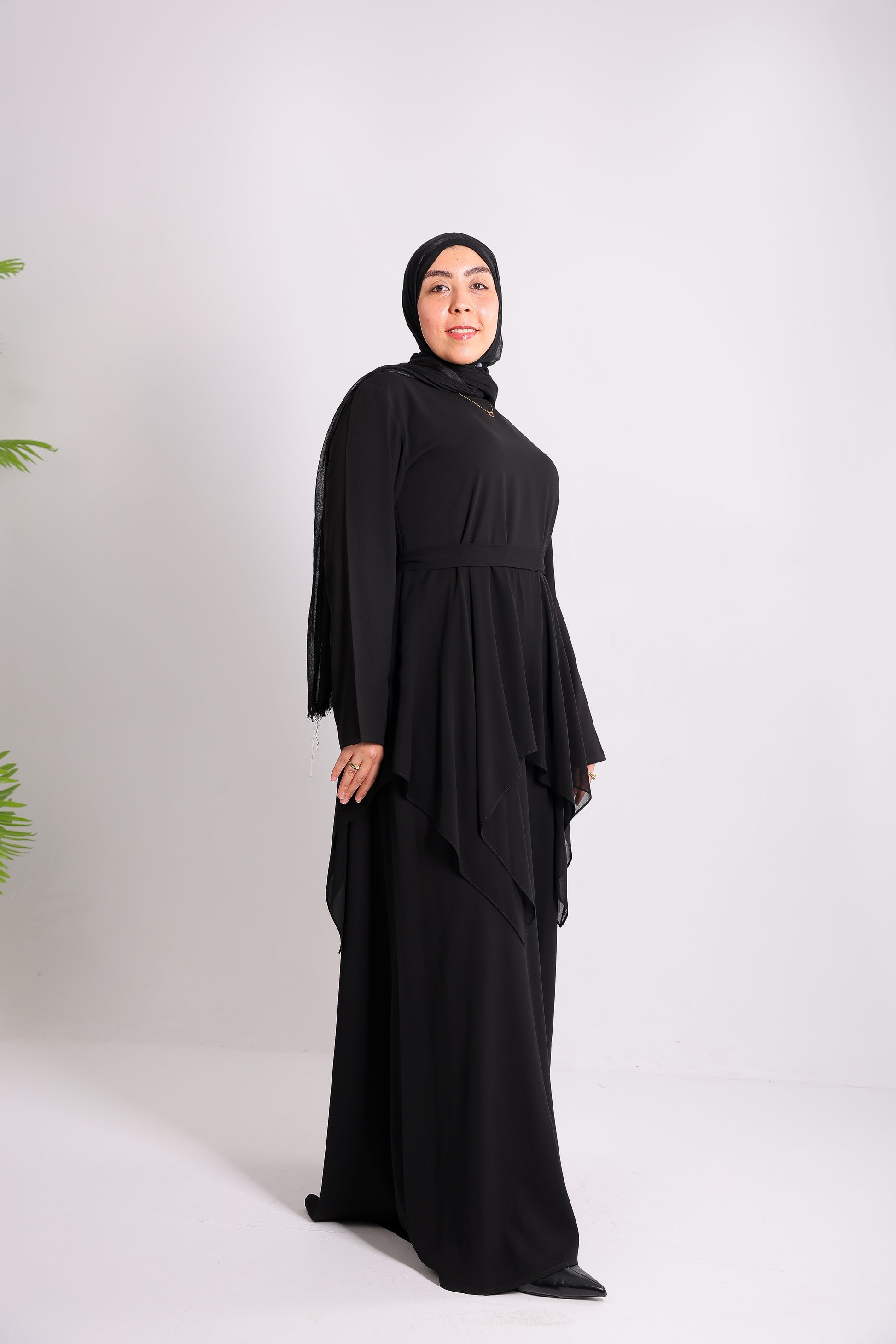 Lily crepe abaya is designed with delicate chiffon ruffles and a matching belt code 112 B