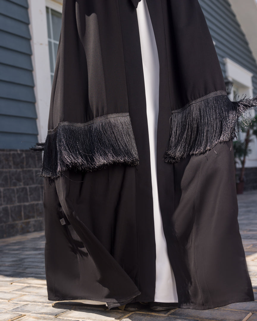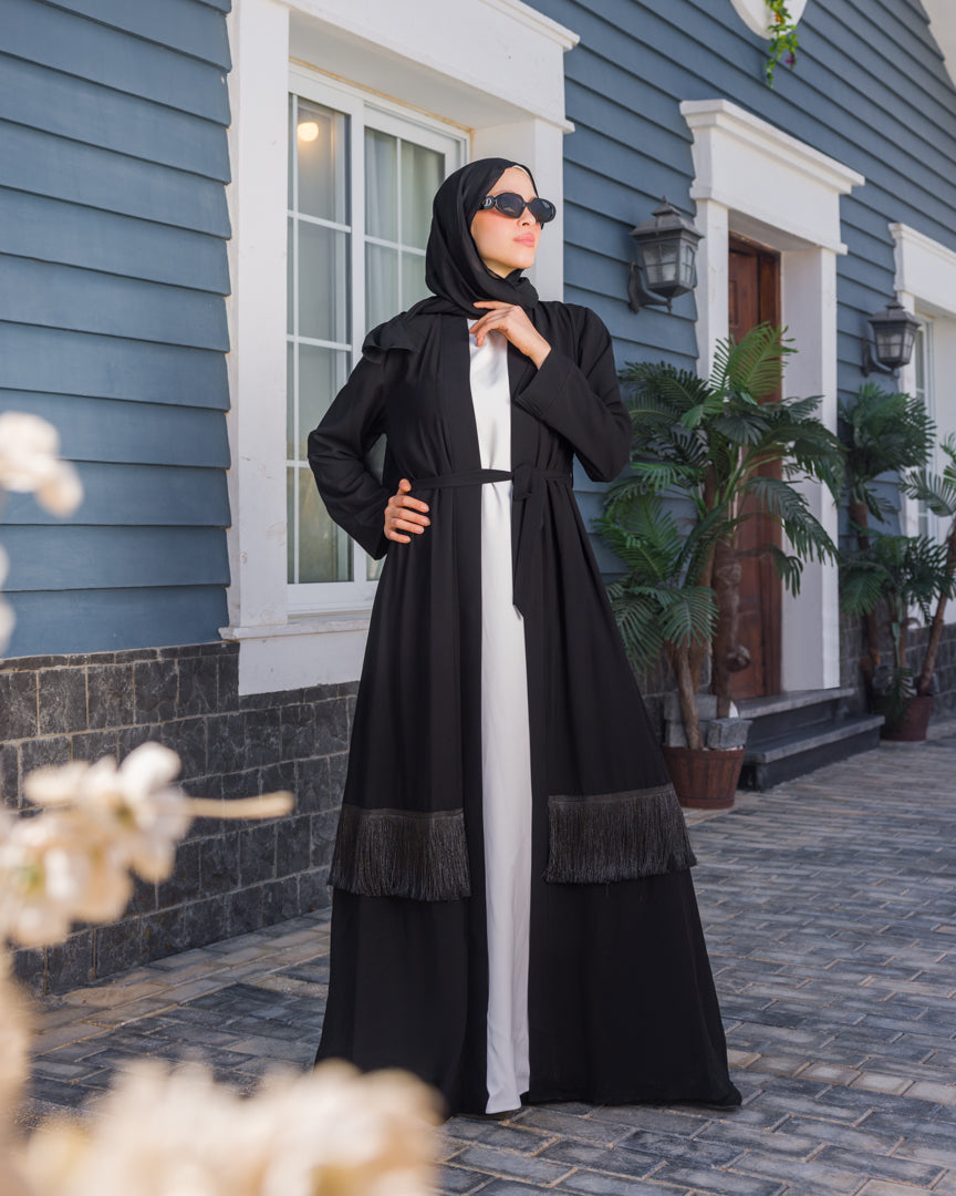 Make a fashion statement with our Open Fringes Crepe Abaya, an exquisite piece that combines elegance with a touch of glamour.