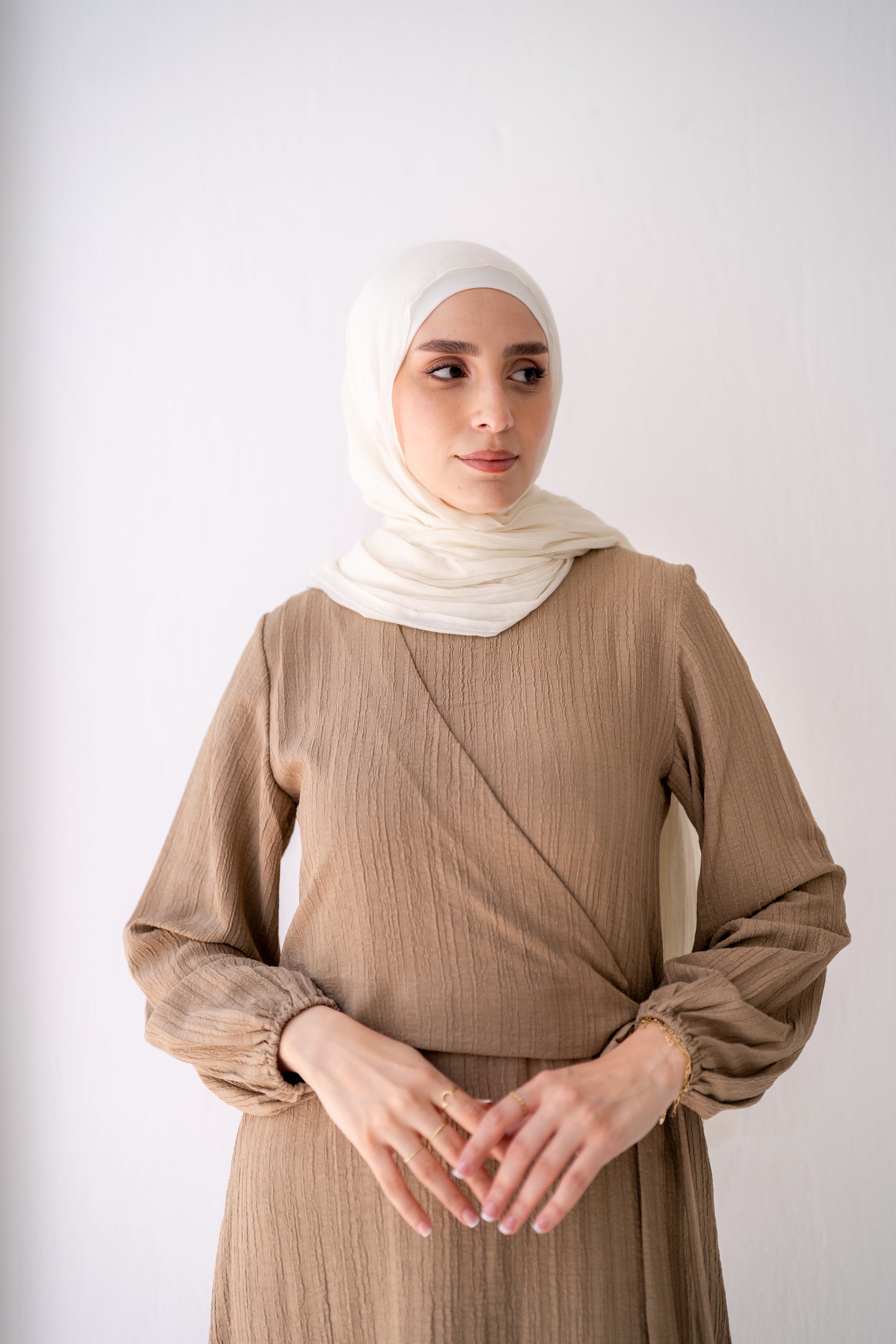 Soft crinkle fabric with an elegant wrap design — timeless, comfy & chic.