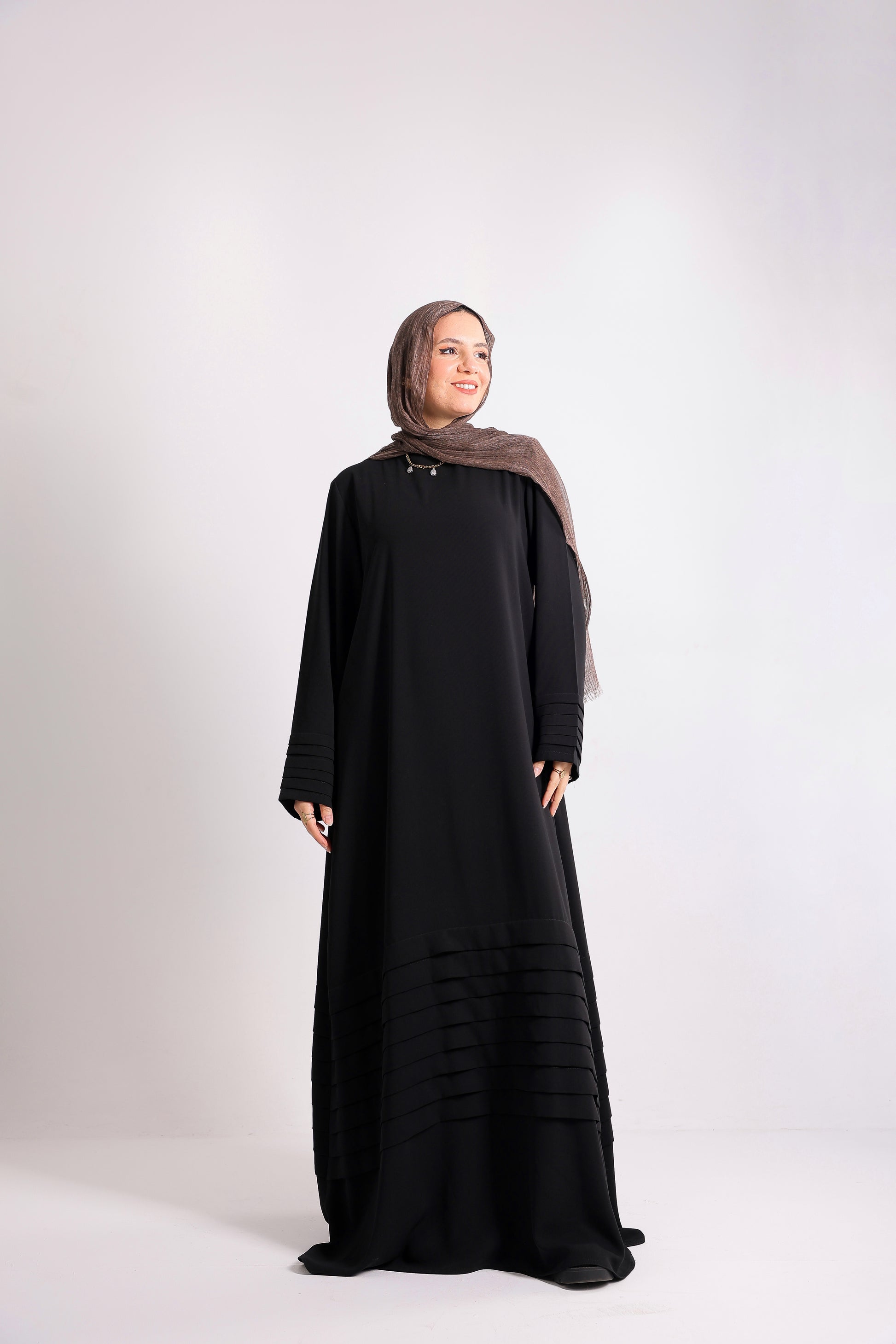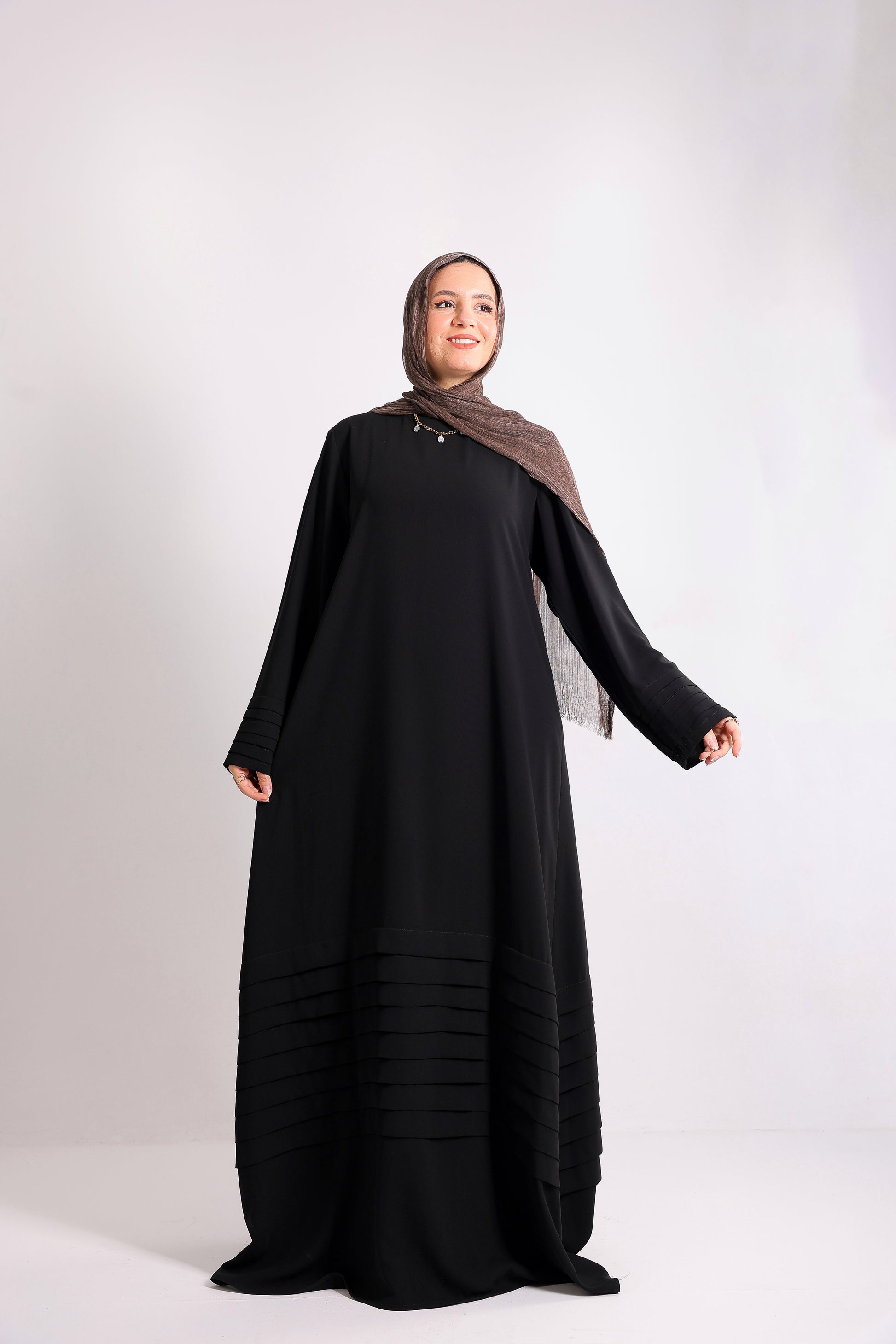 Soft crepe abaya with elegant pleated details on the sleeves and hem. Code 508