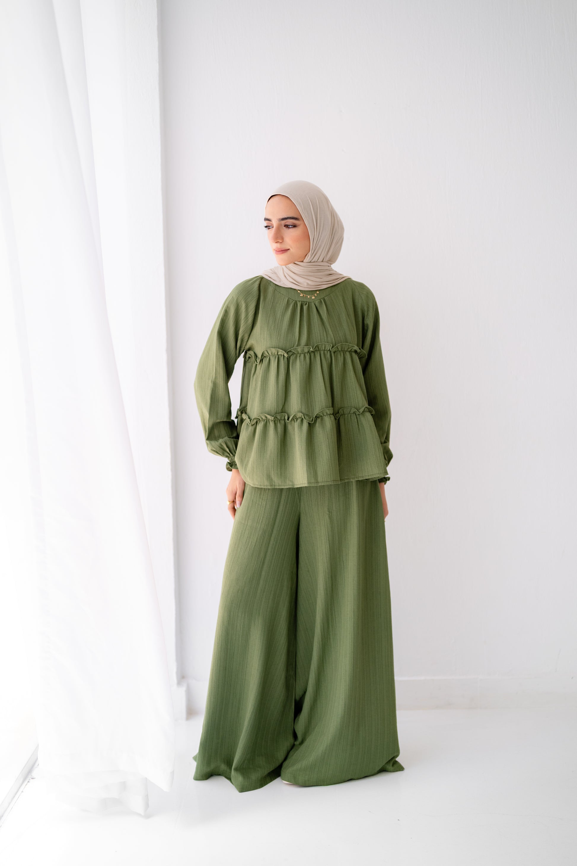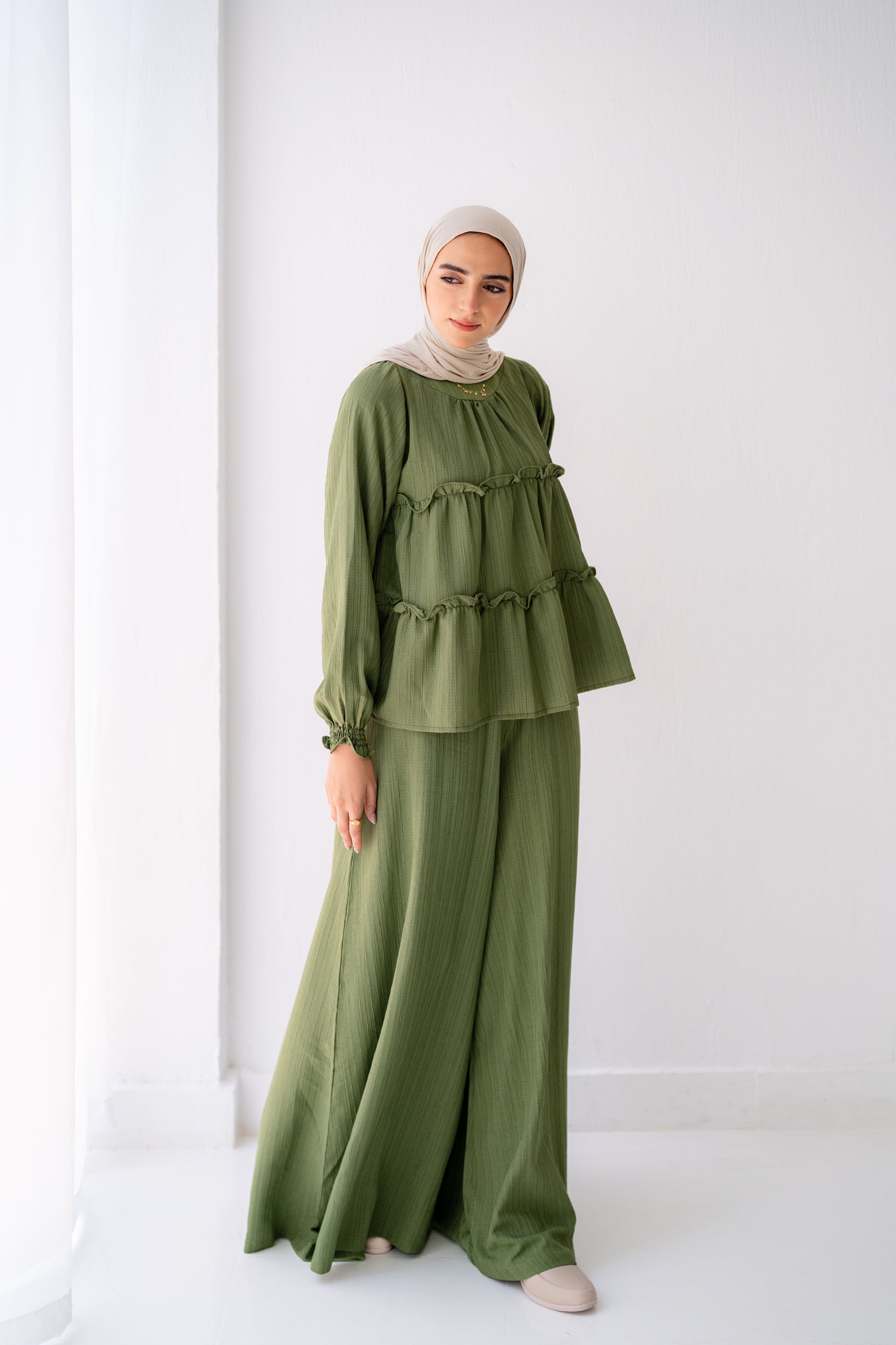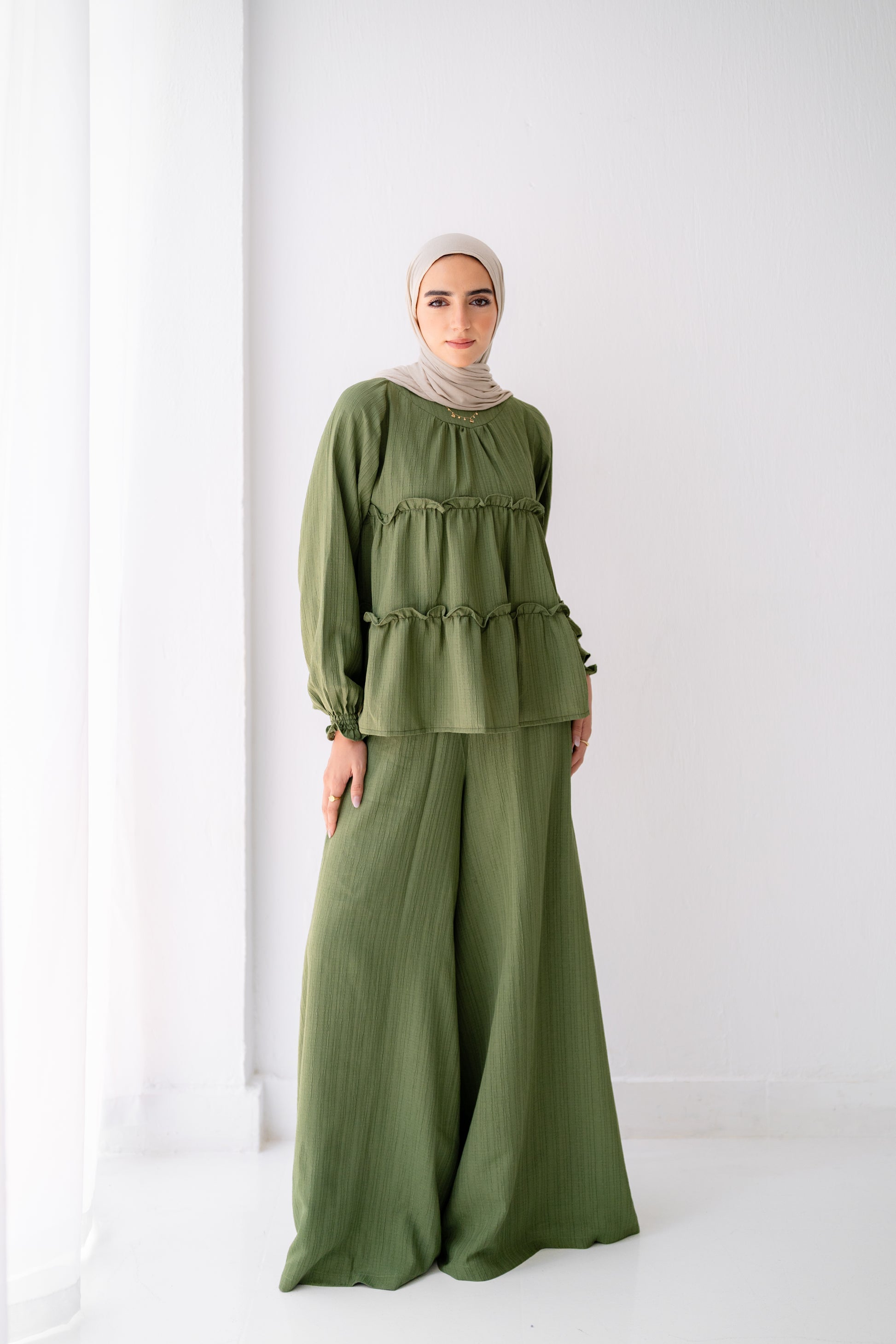 This Green wide-leg pants set with a flowy ruffled top is your go-to choice for comfort and sophistication. Perfect for casual outings or chic gatherings – style that speaks for itself. ✨