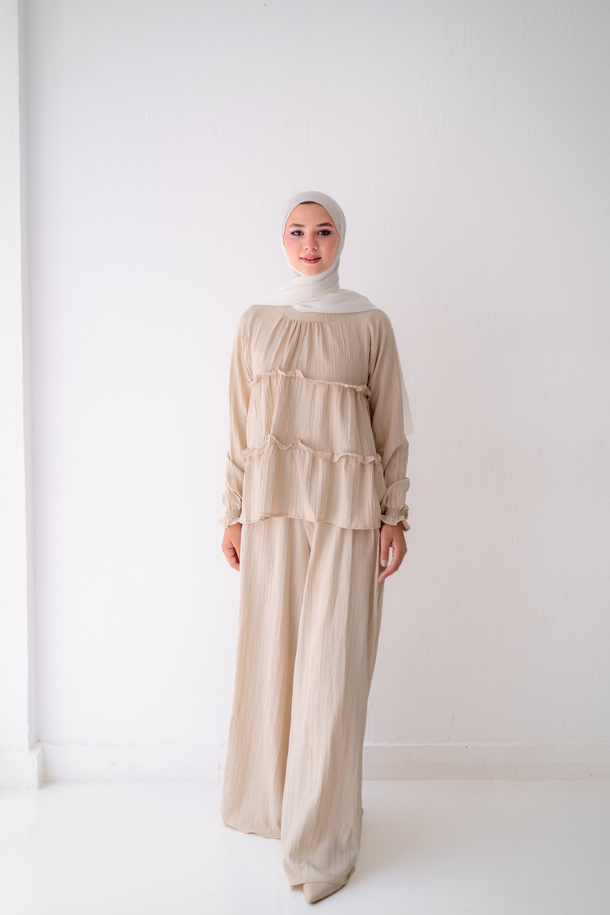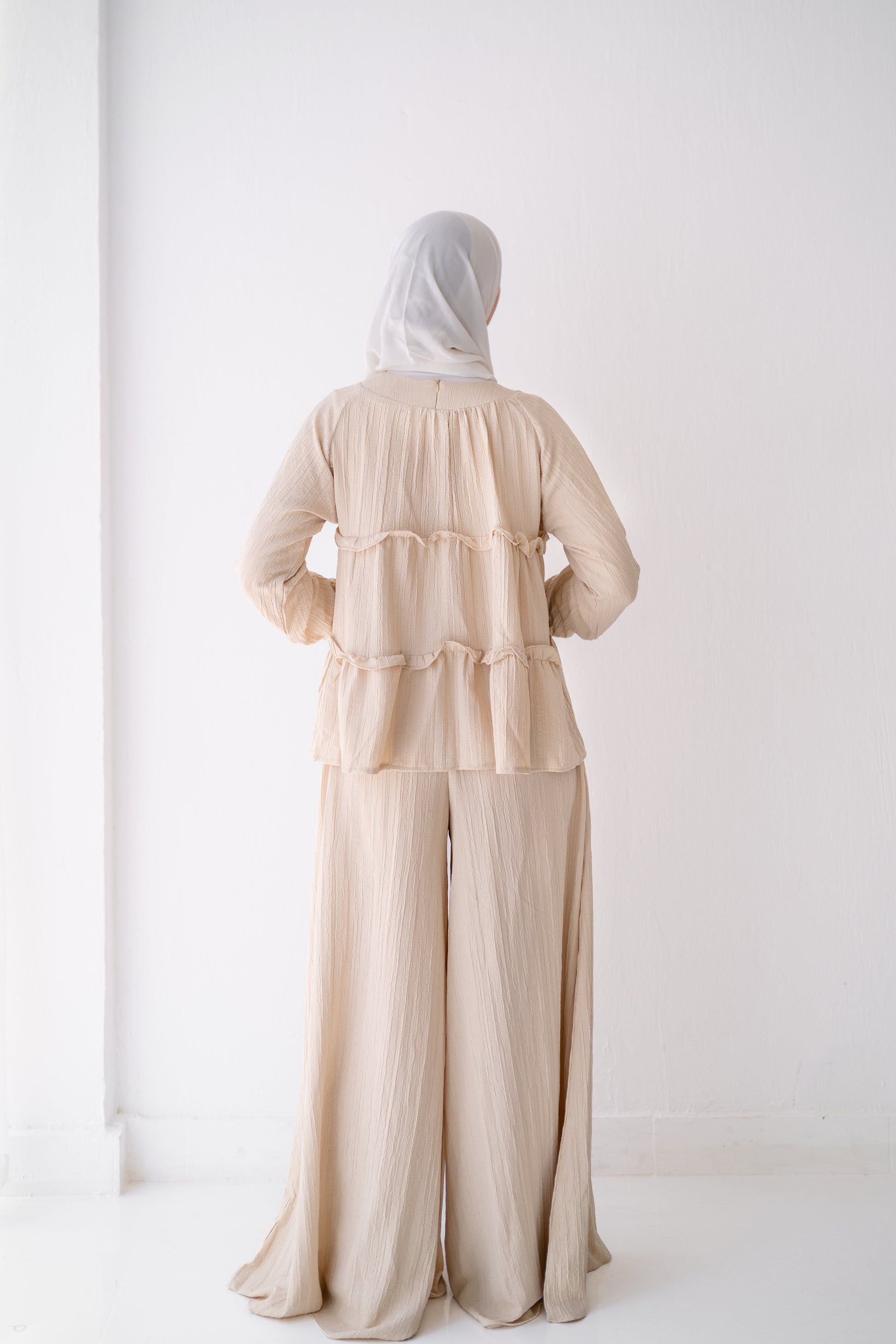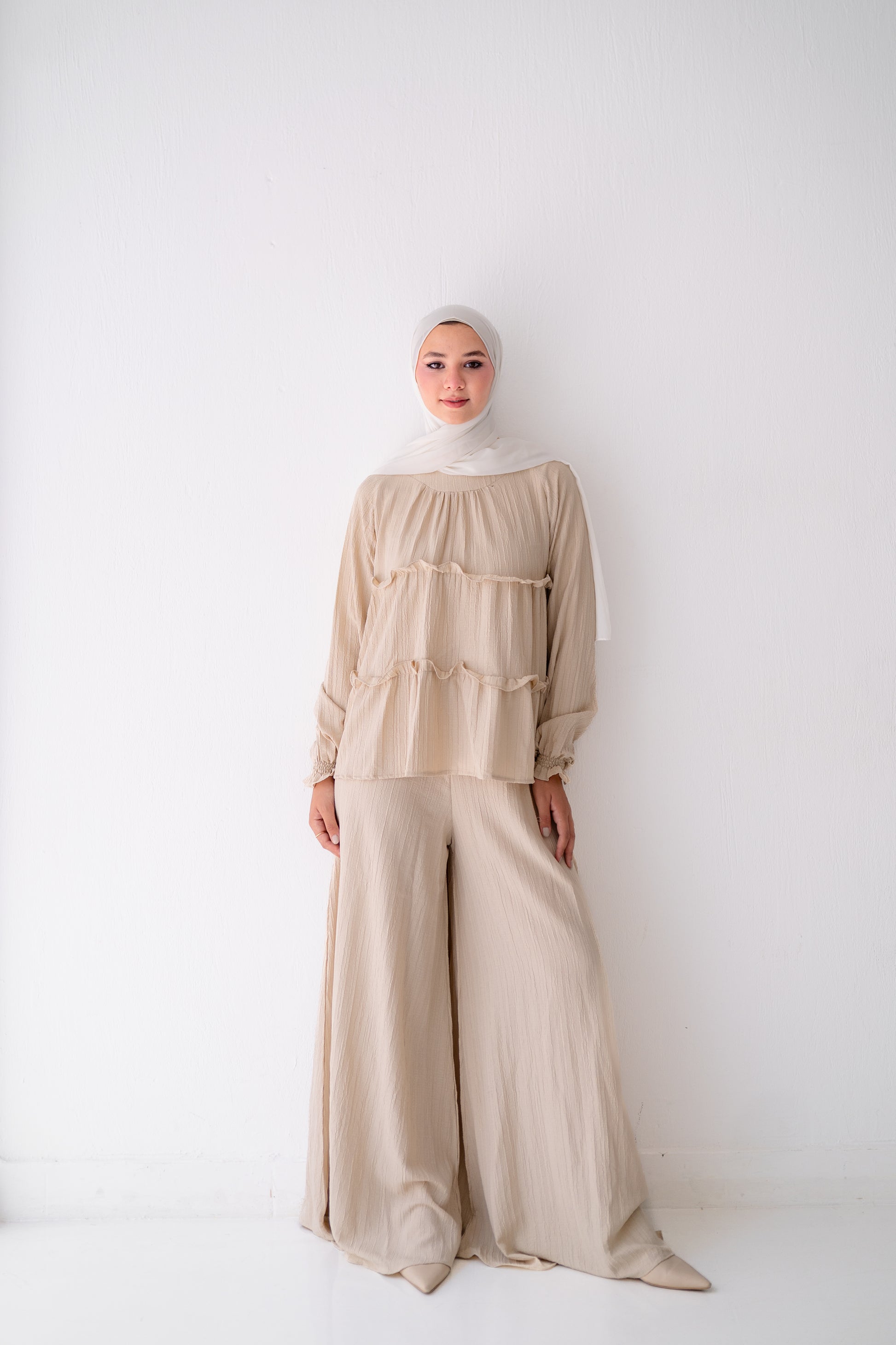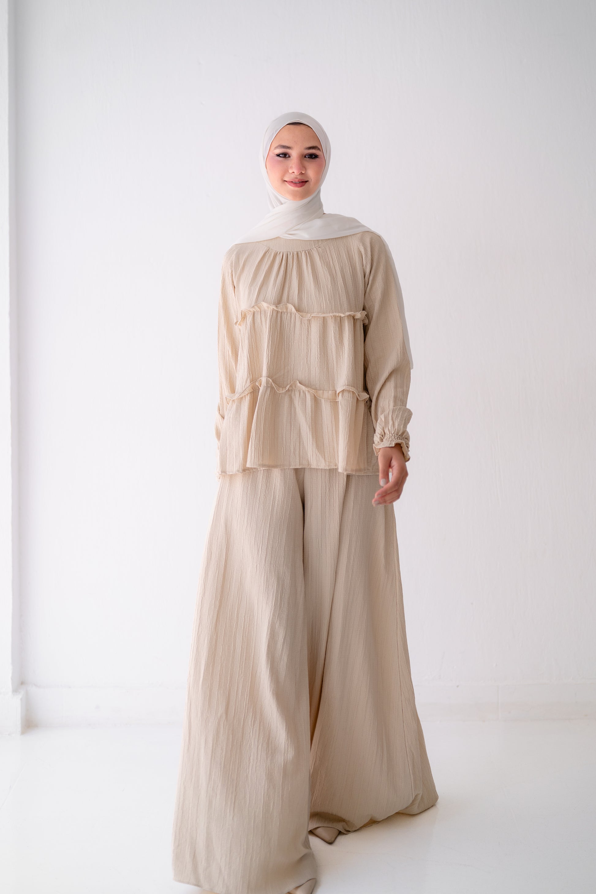 This beige wide-leg pants set with a flowy ruffled top is your go-to choice for comfort and sophistication. Perfect for casual outings or chic gatherings – style that speaks for itself. ✨